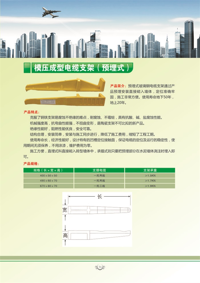 預(yù)埋式玻璃鋼電纜支架通過(guò)產(chǎn)品預(yù)埋安裝直接砌入墻體,定位準(zhǔn)確牢固,施工非常方便。使用壽命地下50年,地上20年
